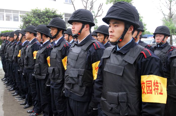 5月5日早晨6時許,全副武裝的校園特衛(wèi)人員整裝待發(fā)。自當(dāng)日起,江蘇省淮安市保安總公司首批46名配備鋼盔、防刺服、防割手套、防暴膠棒、滅火槍、催淚器等防護裝備的專職校園特衛(wèi)人員開始進駐市直23所中小學(xué)和幼兒園,守護校園平安。這些人員都是從全市保安隊伍中精選出來的骨干,年齡在35歲以下,大都有部隊服役的經(jīng)歷,身體素質(zhì)和政治素質(zhì)較好,且受過專業(yè)訓(xùn)練。