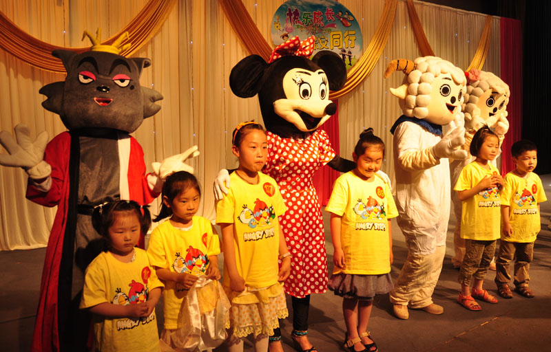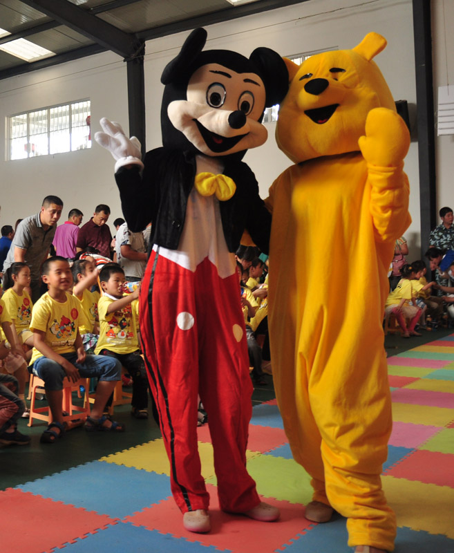 下午兩點(diǎn),活動(dòng)中心內(nèi),播放著一首首兒童歌曲,卡通人物喜羊羊、美羊羊、紅太郎、灰太狼、維尼小熊等在場(chǎng)內(nèi)和孩子們愉快的做著小游戲。每個(gè)到場(chǎng)的孩子憑著入場(chǎng)券在場(chǎng)內(nèi)領(lǐng)取了一件黃色的卡通T恤衫,還有食品和飲料。