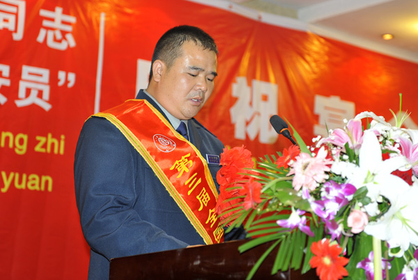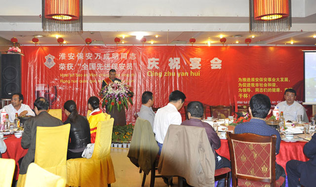 2011年9月29日晚,總公司在天地緣大酒店隆重舉行“萬成明同志榮獲第三屆全國先進保安員稱號慶祝宴會”。宴會之前,王克副總經(jīng)理宣讀了總公司對萬成明同志的表彰決定,徐文剛副總經(jīng)理為萬成明同志頒發(fā)了獎金,同時,萬成明發(fā)表了獲獎感言。
