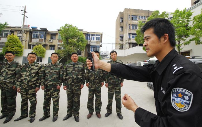 5月8日,淮安特警為校園特衛(wèi)人員講解示范防暴技能。