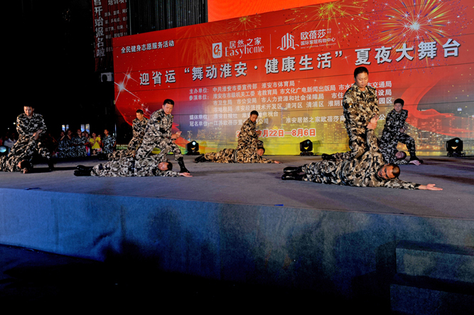 7月30日晚,淮安市公安局在體育館廣場舉辦“舞動(dòng)淮安·健康生活”夏夜大舞臺市民健身活動(dòng)公安專場演出?;顒?dòng)在激昂的鼓韻聲中拉開帷幕??偣镜木实那軘潮硌?、開場舞以及《當(dāng)祖國召喚》等節(jié)目參加活動(dòng),贏得了現(xiàn)場市民的陣陣掌聲?;顒?dòng)中還進(jìn)行了省十八屆運(yùn)動(dòng)會和健康生活知識有獎(jiǎng)問答。市局黨委委員、機(jī)關(guān)黨委書記蘇必偉、總公司總經(jīng)理婁伯翱等領(lǐng)導(dǎo)在現(xiàn)場觀看了演出。市交巡警支隊(duì)、特警支隊(duì)、總公司人防中心等100余人參加活動(dòng)。