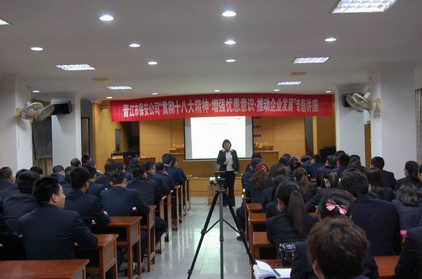 本網(wǎng)-福建省晉江市保安服務(wù)公司消息(通訊員 歐陽(yáng)長(zhǎng)青) 為進(jìn)一步適應(yīng)日益激烈的市場(chǎng)競(jìng)爭(zhēng),切實(shí)推動(dòng)企業(yè)持續(xù)發(fā)展,3月27日-28日,公司結(jié)合“增強(qiáng)憂患意識(shí),推動(dòng)長(zhǎng)遠(yuǎn)發(fā)展”大討論活動(dòng),舉辦“貫徹黨的十八大精神·增強(qiáng)憂患意識(shí),推動(dòng)企業(yè)發(fā)展”專題講座。晉江市委黨校副教授吳蓮妹應(yīng)邀前來(lái)授課。保安公司領(lǐng)導(dǎo)吳輝表、各部門經(jīng)理、工作人員等100多人聆聽了講座。
