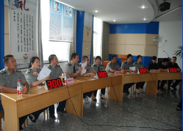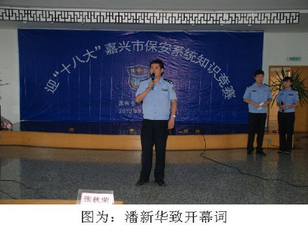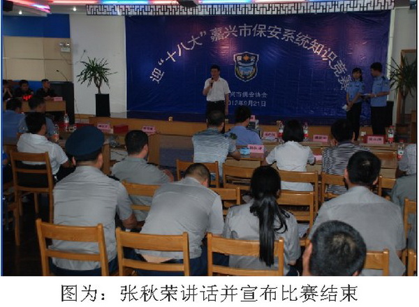 浙江省保安工作消息 為迎接黨的“十八大”順利召開,9月21日下午,浙江省嘉興市保安協(xié)會在嘉興市公安局人民警察培訓(xùn)學(xué)校舉辦了全市“保安系統(tǒng)知識競賽”。省公安廳治安總隊(duì)保安科科長、省保安協(xié)會秘書長傅志方,省公安廳治安總隊(duì)保安科壽俊杰,市保安協(xié)會常務(wù)副會長兼秘書長張秋榮,市保安服務(wù)公司總經(jīng)理、市保安協(xié)會副會長皇甫玉明等領(lǐng)導(dǎo)蒞臨現(xiàn)場觀摩指導(dǎo)。嘉興市公安局治安支隊(duì)政委潘新華和治安支隊(duì)副支隊(duì)長朱忠華分別致了比賽開幕詞和閉幕詞。由市局特警支隊(duì)政委陸永清等四人組成的評委團(tuán)對比賽全程進(jìn)行了監(jiān)督、評判。