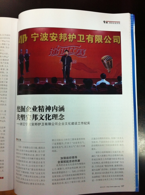 2012年,寧波安邦護(hù)衛(wèi)有限公司通過開設(shè)“建設(shè)優(yōu)秀的企業(yè)文化”專題講座、刊發(fā)“企業(yè)文化建設(shè)專輯”、組織安邦文化核心價(jià)值觀討論、征集企業(yè)名片(口號(hào))、舉辦隊(duì)列會(huì)操和演講比賽等活動(dòng),著力推進(jìn)企業(yè)文化建設(shè),顯著提升公司軟實(shí)力、核心競(jìng)爭(zhēng)力和員工整體素質(zhì),取得了一定成效。2013年1月,今年第1期《中國(guó)保安》(總第279期)雜志 “保安企業(yè)文化”專題欄目刊登《挖掘企業(yè)精神內(nèi)涵,共塑安邦文化理念——浙江寧波安邦護(hù)衛(wèi)有限公司企業(yè)文化建設(shè)工作紀(jì)實(shí)》,對(duì)寧波安邦護(hù)衛(wèi)有限公司企業(yè)文化建設(shè)情況進(jìn)行了報(bào)道,進(jìn)一步擴(kuò)大了公司的行業(yè)知名度和社會(huì)影響力。