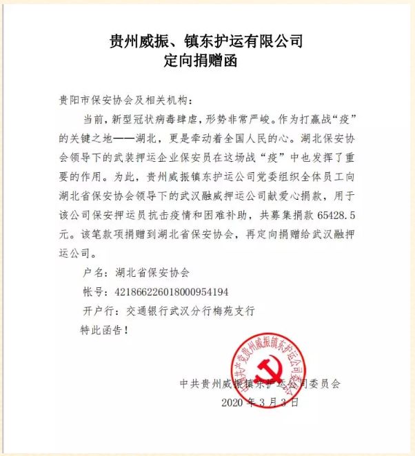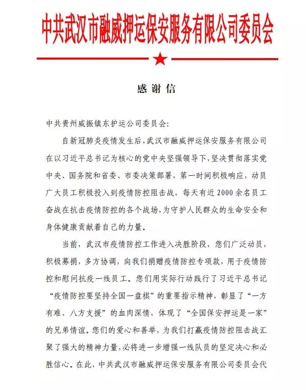 近日,貴州威振鎮(zhèn)東護(hù)運(yùn)公司黨委動(dòng)員組織廣大員工,積極為我公司募捐愛(ài)心捐款,用于疫情防控和慰問(wèn)抗疫一線(xiàn)員工,并經(jīng)多方協(xié)調(diào),將捐贈(zèng)專(zhuān)項(xiàng)款項(xiàng)送達(dá)到我公司。在武漢市疫情防控工作進(jìn)入決勝階段,貴州威振鎮(zhèn)東護(hù)衛(wèi)公司的愛(ài)心,為我們打贏疫情防控阻擊戰(zhàn)匯聚了強(qiáng)大的精神力量,必將進(jìn)一步增強(qiáng)一線(xiàn)隊(duì)員的堅(jiān)定決心和必勝信心。武漢市融威押運(yùn)公司黨委及全體員工對(duì)貴州威振鎮(zhèn)東護(hù)運(yùn)公司黨委和全體員工,以及提供協(xié)調(diào)支持的貴陽(yáng)市保安協(xié)會(huì)、湖北省保安協(xié)會(huì)和武漢市保安協(xié)會(huì)等機(jī)構(gòu),表示誠(chéng)摯的感謝和崇高的敬意!