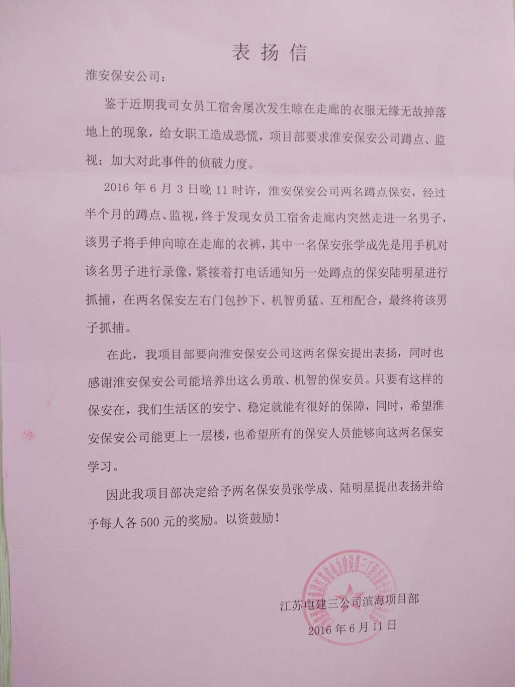 2016年6月11日駐江蘇電建三公司濱海項目部濱海執(zhí)勤點保安員張學(xué)成、陸明星智勇擒賊的行為提出了表揚,并給予現(xiàn)金獎勵。