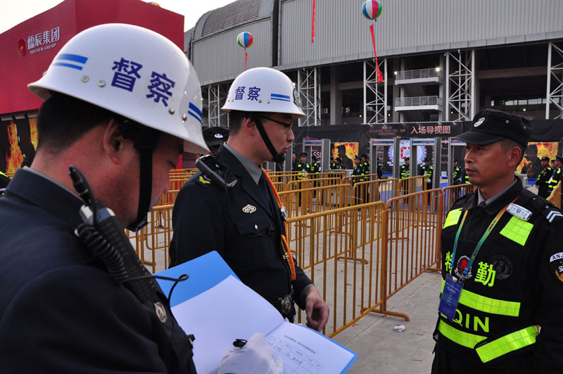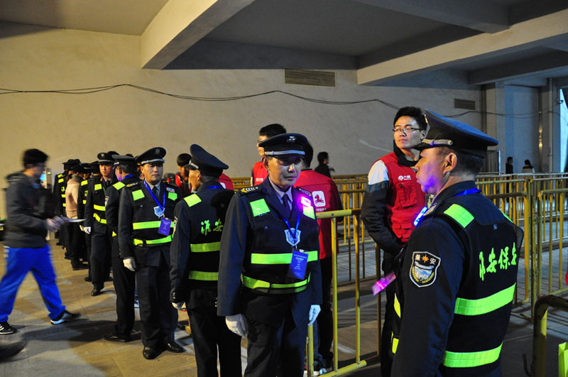 為做好安保工作,11月2日上午,人防中心專門組織參加臨沂安保人員進(jìn)行專項(xiàng)培訓(xùn)。3日上午7:00集合出發(fā),提前到達(dá)臨沂大學(xué),按照承辦方要求,現(xiàn)場(chǎng)搭建300米防爆墻,10個(gè)預(yù)檢票口通道,承擔(dān)了25000名觀眾入場(chǎng)的安檢、檢票通道的秩序維護(hù)等安保任務(wù)。