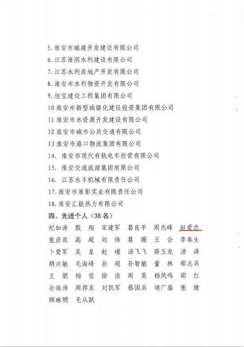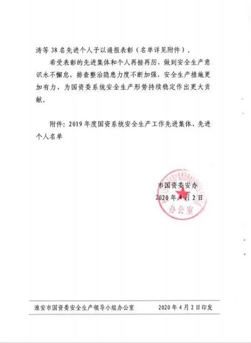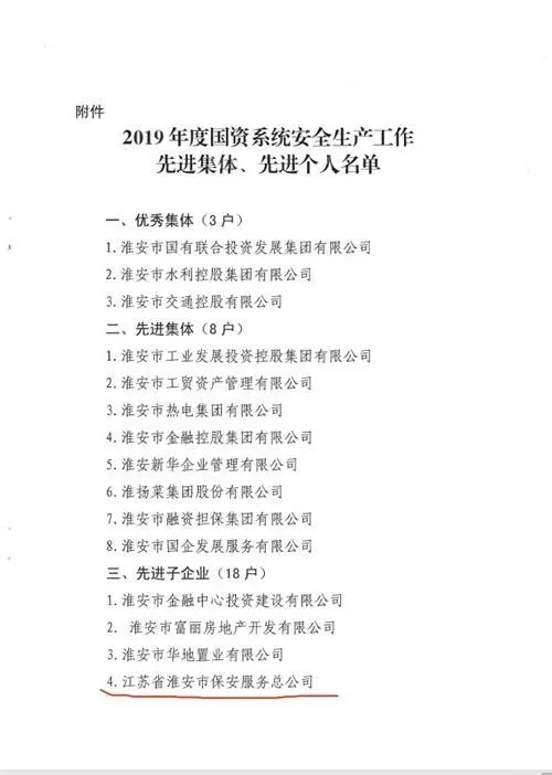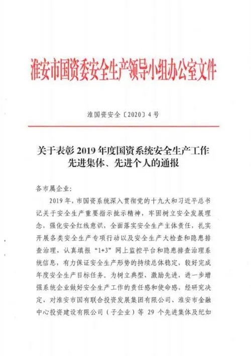 2020年4月2日,淮安市國資委通報表揚2019年度國資系統(tǒng)安全生產(chǎn)先進集體和個人,淮安保安以“零事故”“零隱患”表現(xiàn)榮膺先進集體。公司黨總支書記、總經(jīng)理趙愛忠榮膺先進個人。